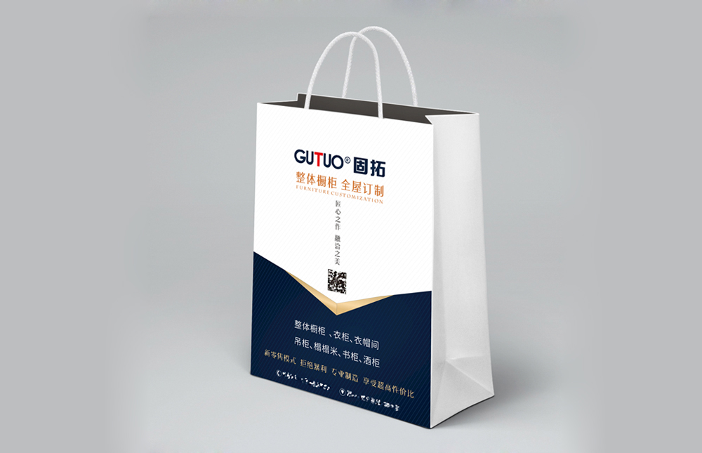 設(shè)計理念:本款家具手提袋設(shè)計以簡潔為主,以白色為主體顏色,正面以紅色logo“原木匠”突出主題,紙袋兩側(cè)邊放置公司定制、名稱、電話、二維碼等信息。
