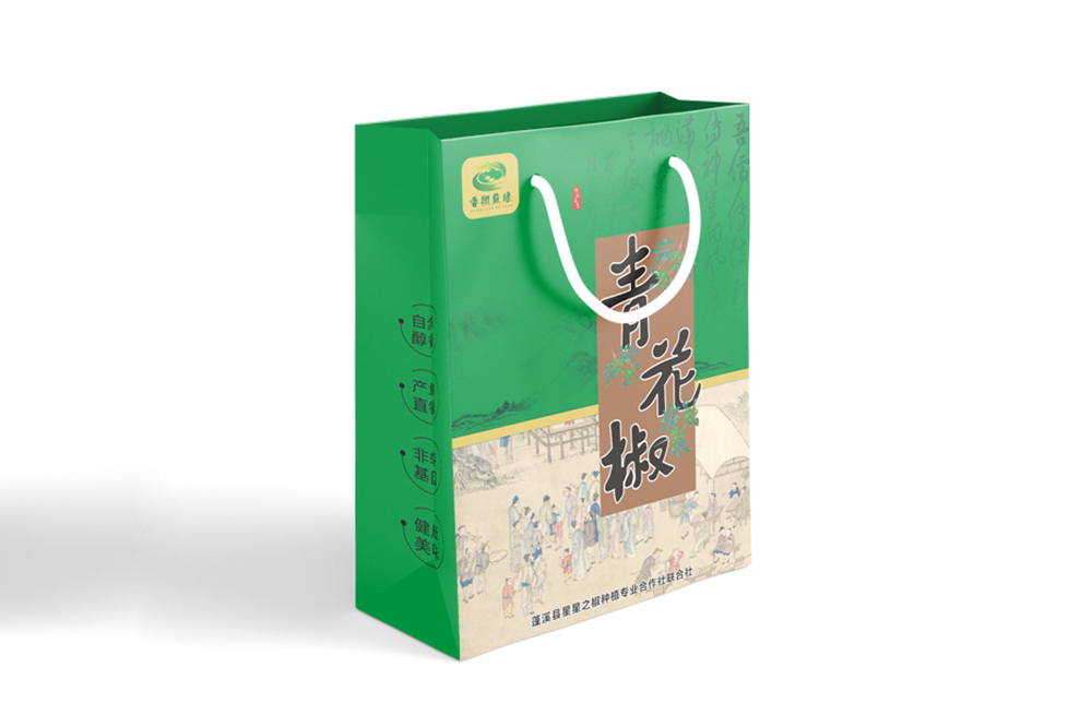 設計理念:本款包裝是一款青花椒紙盒、手提袋配套禮盒,包裝色彩提取青花椒的綠色為主色調,包裝設計風格采用中國風的水墨文字設計,配上古代熱鬧、繁華的街景圖案,呈現出一種歡快、祥和的景象,給消費者帶來一種愉快的購物心情。